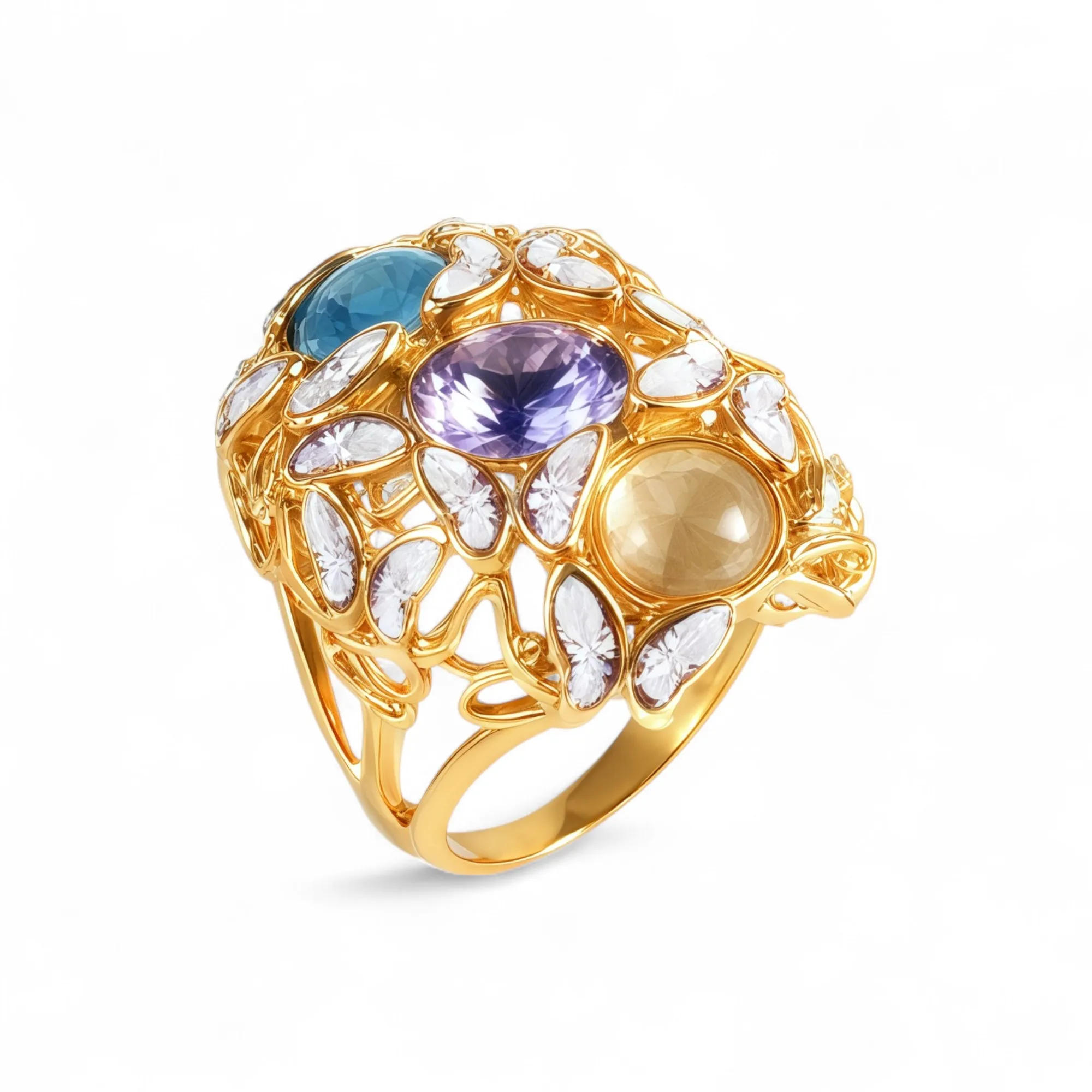 Vintage Multi-Gemstone Textured 24K Gold PVD Stainless Steel Titanium Women’s Ring